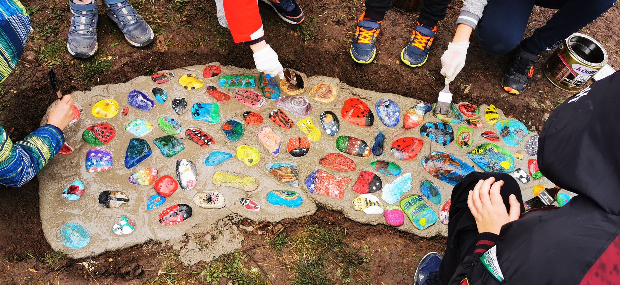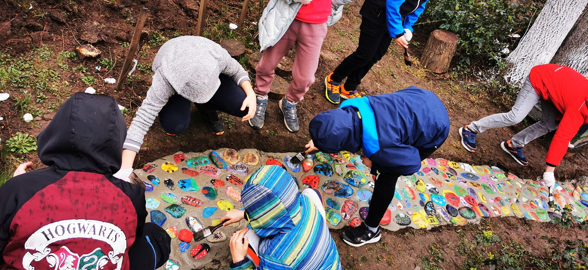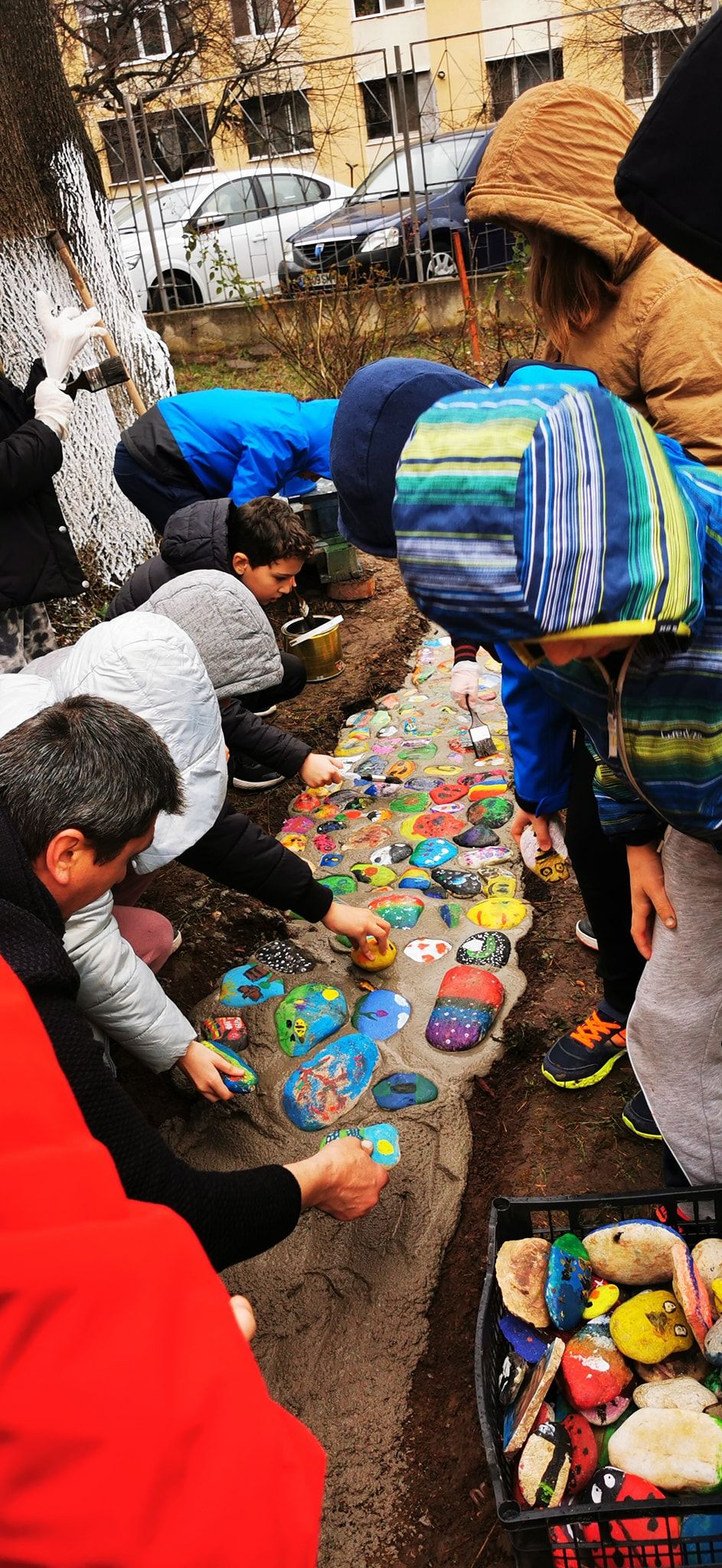 Activități practice de cimentare a pietrelor pictate, lăcuire și asamblarea lor într-un mozaic colorat ce va constitui o alee pe care elevii vor păși în grădina școlii.